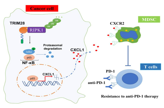 研究結(jié)果顯示TRIM28的表達(dá)與NSCLC中抑制性髓源性抑制細(xì)胞(MDSCs)的浸潤呈正相關(guān)。此外,沉默TRIM28可通過重塑炎癥腫瘤微環(huán)境來增強(qiáng)抗pd -1免疫治療的療效。在機(jī)制上,研究者證明TRIM28可以物理地與受體相互作用蛋白激酶1 (RIPK1)相互作用,并促進(jìn)k63相關(guān)的RIPK1泛素化,這對于維持NF-κB通路的激活至關(guān)重要。E3連接酶結(jié)構(gòu)域的突變證實(shí)了E3連接酶活性在trim28介導(dǎo)的NF-κB激活中的重要作用。進(jìn)一步實(shí)驗(yàn)發(fā)現(xiàn)TRIM28可通過激活NF-κB信號(hào)通路上調(diào)CXCL1的表達(dá)。CXCL1可與MDSCs上的CXCR2結(jié)合,促進(jìn)其向腫瘤微環(huán)境遷移。TRIM28敲除增加了免疫功能小鼠對抗pd -1治療的反應(yīng)性,其特征是CD8+T腫瘤浸潤淋巴細(xì)胞增加,MDSCs減少。