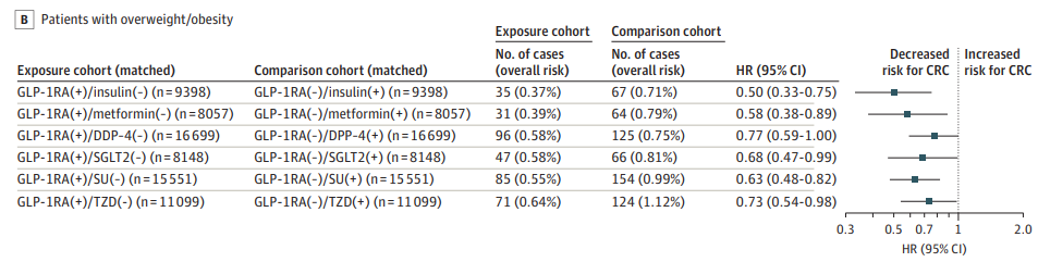 在整個(gè)人群中,GLP-1受體激動(dòng)劑對(duì)結(jié)直腸癌的影響。此外,與其他5種非GLP-1受體激動(dòng)劑抗糖尿病藥物相比,GLP-1受體激動(dòng)劑治療也與較低的結(jié)直腸癌風(fēng)險(xiǎn)相關(guān)。最后,研究團(tuán)隊(duì)還在肥胖/超重患者分析了不同藥物對(duì)結(jié)直腸癌發(fā)病率的影響。研究發(fā)現(xiàn),在肥胖/超重患者中,與胰島素相比,GLP-1受體激動(dòng)劑治療患結(jié)直腸癌的風(fēng)險(xiǎn)降低50%;與二甲雙胍相比,GLP-1受體激動(dòng)劑治療患結(jié)直腸癌的風(fēng)險(xiǎn)降低42%。