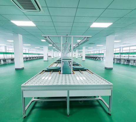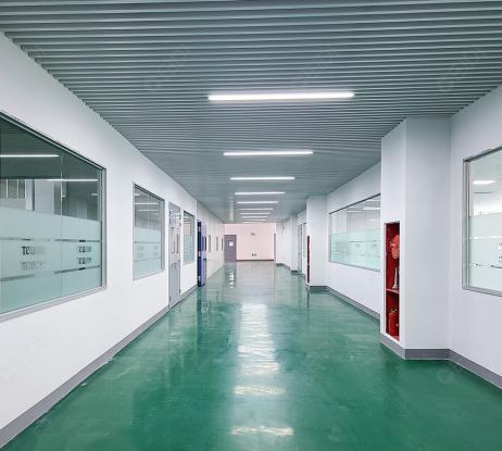 三層電控車間地面、吊頂全部做防靜電處理,且地面區(qū)域以6S車間標準劃分標示線(熱熔膠)。地面整體無縫,并與墻面一體化,環(huán)氧鋪至墻面(包括與土建墻接觸位置),與墻板平齊。